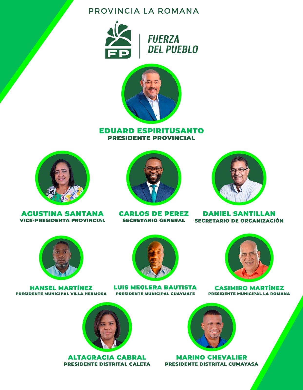 Al frente de esta estructura se encuentra el *Senador Eduard Espiritusanto, Presidente Provincial* , quien asume el rol de mánager del equipo, encargado de dirigir la estrategia política, coordinar las acciones y conducir a la Fuerza del Pueblo hacia nuevas victorias en la provincia de La Romana.