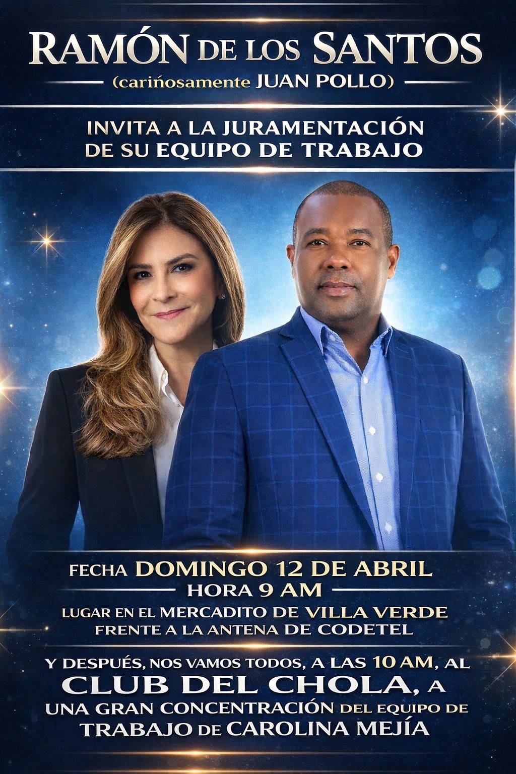 El reconocido dirigente Empresario y Político Lic. Ramón de los Santos Mercedes, ampliamente conocido como "Juan Pollo", anunció formalmente la celebración del acto de juramentación de su equipo de trabajo, en un evento que busca consolidar el apoyo a la gestión y visión de Carolina Mejía.